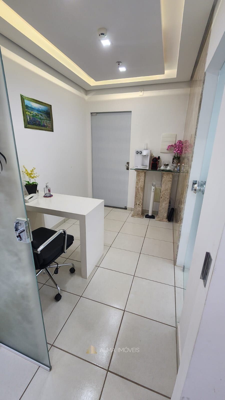 - Sala 01 com mesa de vidro/madeira e 2 cadeiras giratórias